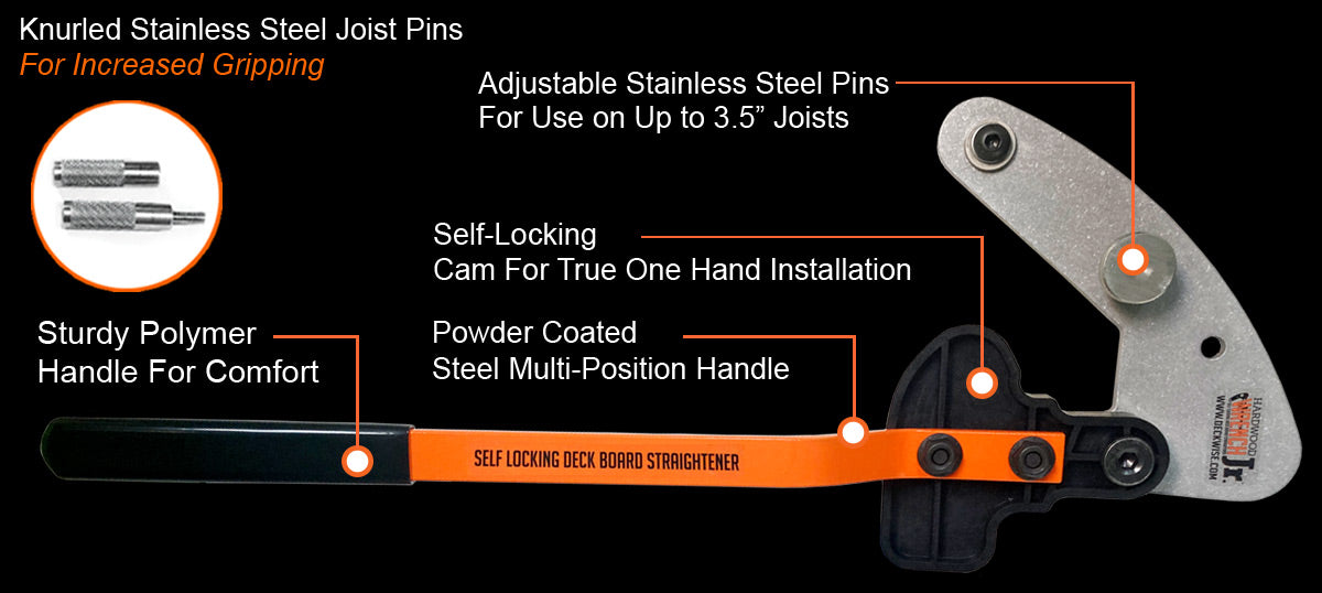The Hardwood Wrench™ and Hardwood Wrench Jr.™ deck board straightening tools are simple to operate. They provide a single deck installer the strength needed to straighten ANY deck board. A simple swing of the tool handle pushes the most warped or bowed board straight as an arrow.