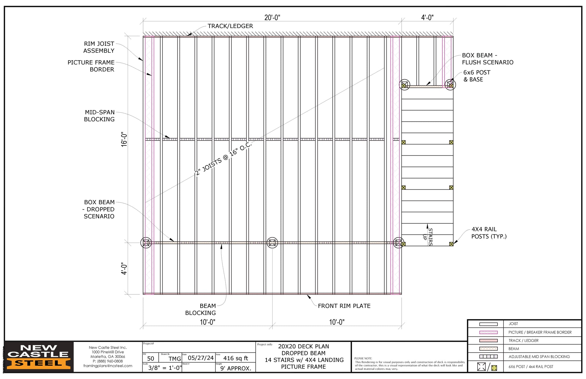 New Castle Steel Deck Framing Kit - 20x20 Deck, Dropped Beam, Picture Frame, 14 Stairs with 4x4 Landing