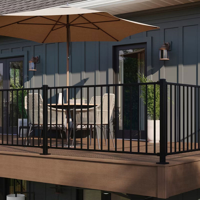 Pre-assembled steel panel with square balusters in a horizontal layout. Powder-coated Charcoal Black. Comes in 6′ or 8′ clear spans, available in 36″ or 42″ heights, ready to drop into pre-installed posts.